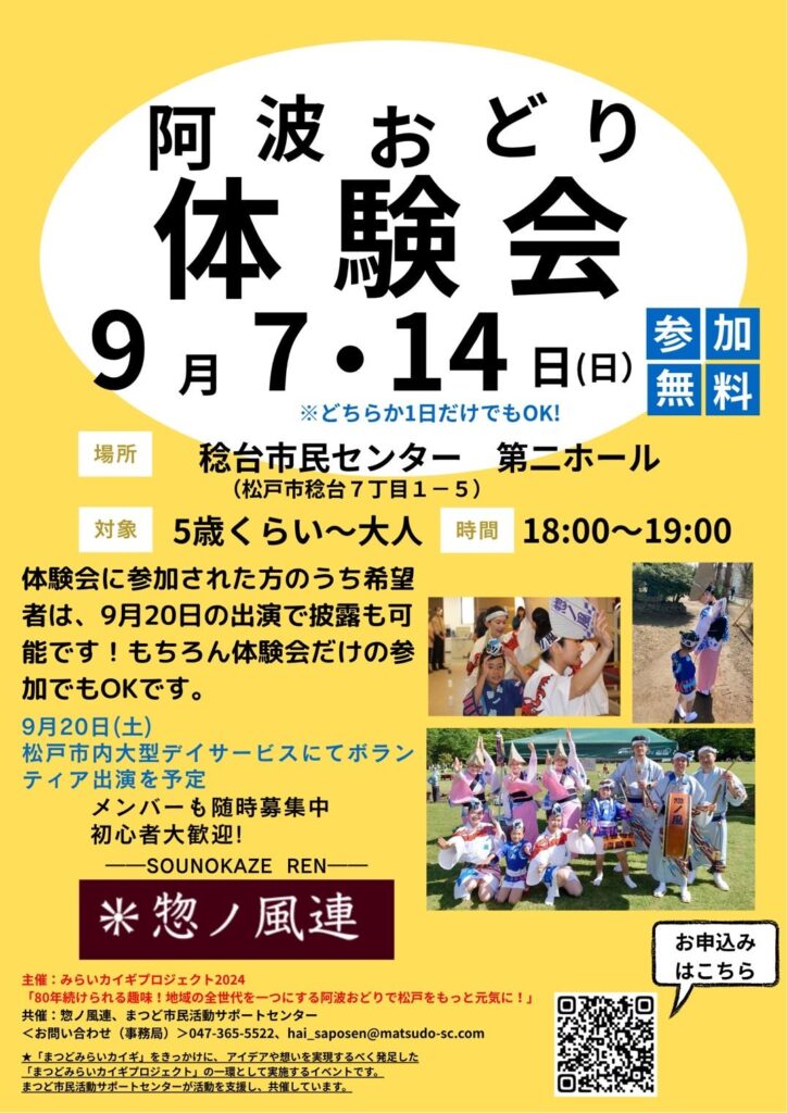 2025年8月16日 / 最終更新日時 : 2025年8月16日 sounokaze お知らせ 【お知らせ】09/07と09/14は阿波踊り体験会を実施します 09/07と09/14は阿波踊り体験会を実施します どちらか1日のみの参加も大歓迎です 奮ってご参加ください 場所:稔台市民センター 第二ホール 対象:5歳くらい~大人 時間:18:00~19:00 Follow me! @sounokaze